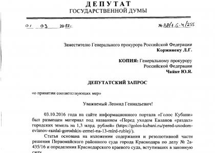 На имя депутаты Госдумы В.Ф. Рашкина пришел ответ на его депутатский запрос от и.о. прокурора Краснодарского края И.А. Бабаева.