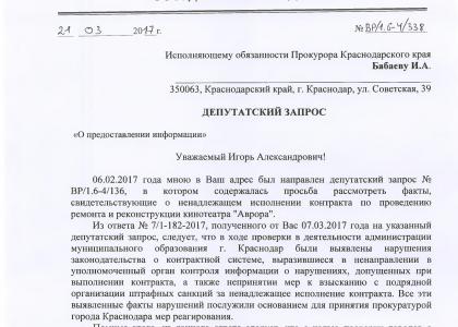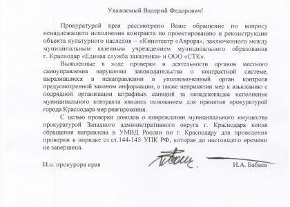 Краснодарский край. Прокуратура сообщила С.П. Обухову и В.Ф. Рашкину, какие меры ею были предприняты для устранения ранее выявленных нарушений при реконструкции кинотеатра «Аврора» в Краснодаре.