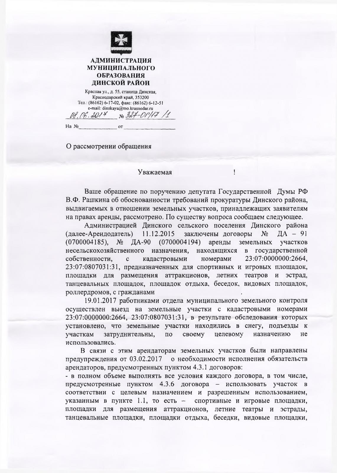 В адрес депутата Государственной Думы VIсозыва Обухова С.П. и депутата Государственной Думы VIIВ.Ф. Рашкина поступило обращение нескольких жителей Динского района Краснодарского края.