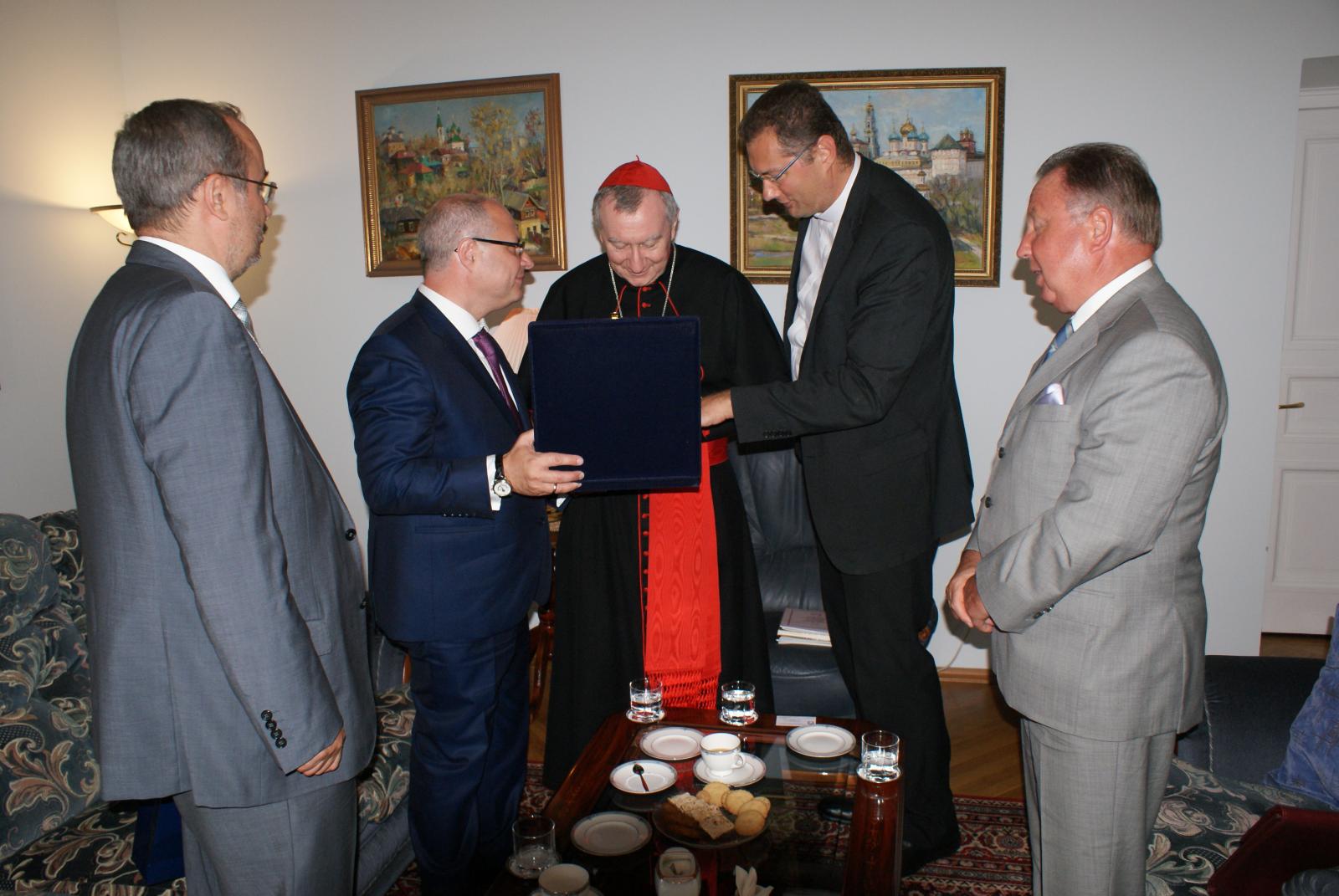 Традиционные промыслы для России – гжель и ростовская финифть. Такие сувениры с изображением Москвы и здания российского парламента были преподнесены по окончанию встречи председателем Комитета Государственной Думы по развитию гражданского общества Сергеем Гавриловым Госсекретарю Ватикана кардиналу П. Пролини.