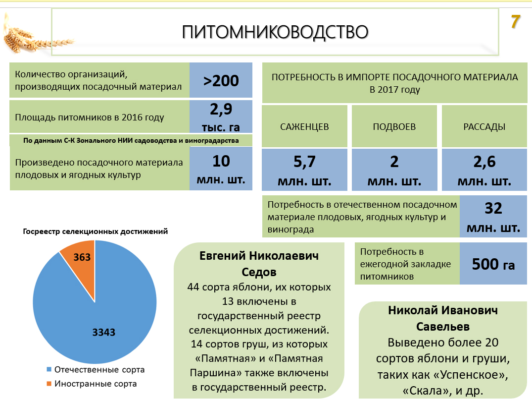 Добрый день, уважаемые Коллеги! Хочу начать свой доклад со слов благодарности всем коллективам научных и производственных организаций, а также любителям-садоводам-энтузиастам, чьей целью является развитие садоводства и питомниководства в Российской Федерации. От Вашего труда, Ваших сил и целеустремленности во многом зависит эффективность обеспечения продовольственной безопасности, здоровья нации. И, конечно, давайте поаплодируем нашим хлеборобам за их успешный труд в этом году, за рекордные урожаи!
