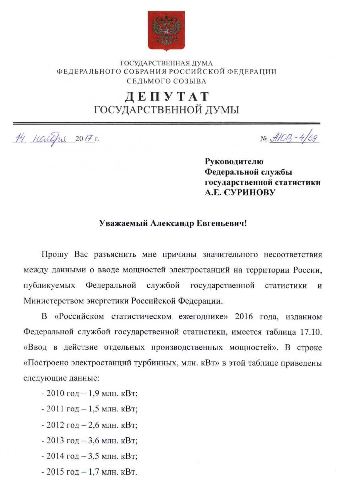 Я направил депутатский запрос руководителю Федеральной службы государственной статистики А.Е. Суринову. Надеюсь, этот запрос поможет выяснить причину столь значительной разницы в данных о вводе мощностей в электроэнергетике, публикуемых двумя государственными ведомствами. Речь идет о жизненно важном для страны вопросе. И я обязательно информирую читателей сайта КПРФ об ответе руководства Росстата.