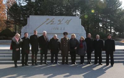 самых почитаемых мест столицы – возле Кымсусанского Дворца Солнца. Посетили Посольство России в КНДР, Храм науки и техники Монумент идей Чучхе, обувную фабрику Рювон, Мангендэский дворец