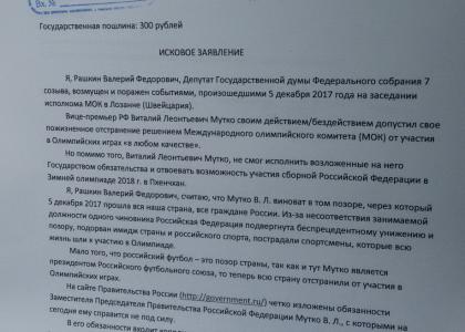 6 декабря 2017 года депутат Госдумы от КПРФ Валерий Рашкин подал иск против Виталия Мутко.