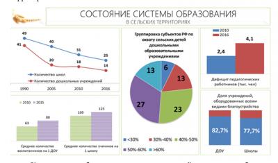 Количество образовательных учреждений имеет стабильную тенденцию к сокращению. К 2016 году в сельских территориях осталось всего 25 тыс. общеобразовательных учреждений и 14 тыс. детских садов. А этой соответственно в 2 и 3 раза меньше, чем было в 1990 году.