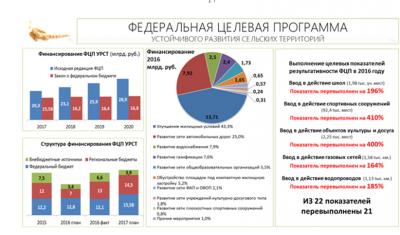 Более 83% финансовых средств ФЦП направляется на улучшение жилищных условий, развитие сети автомобильных дорог, водоснабжение и газификацию, что, безусловно, является важным и необходимым. Озабоченность при этом вызывают объемы финансирования таких направлений, как развитие общеобразовательных организаций, развитие сети фельдшерско-акушерских пунктов, развитие сети учреждений культурно-досугового типа - в сумме всего 9,4% расходов ФЦП.