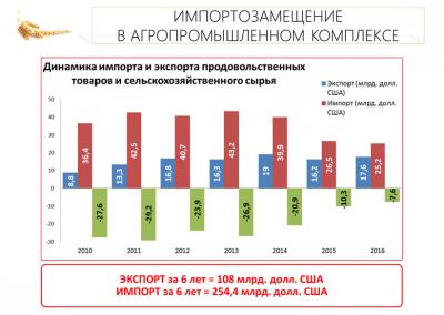 В целом мы подвинули вопрос с импортозамещением масла, сахара, многих других важнейших продовольственных товаров. Но внешний торговый баланс за последние 6 лет у нас остался отрицательным – 146 миллиардов долларов мы за этот период потеряли.