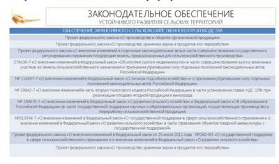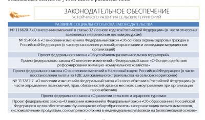 В Государственную Думу уже внесен ряд законодательных инициатив, являющихся приоритетными с точки зрения укрепления экономической составляющей устойчивого развития сельских территорий: