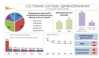 Сохраняет актуальность дефицит медицинских кадров. В 2016 году в сельской местности не хватало уже 94,8 тыс. медицинских специалистов, из которых 24,6 тыс. – врачи.