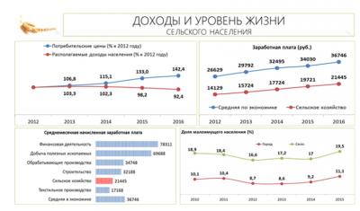 Заработная плата в сельском хозяйстве на протяжении последних лет сохраняется на уровне 58% средней зарплаты по экономике, и в 2016 году составила всего 21,4 тысячи рублей (против 36,7 тысяч). Не удивительно, что и доля малоимущего населения на селе почти в 2 раза выше, чем в городе и составляет 19,5%.