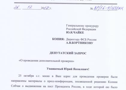 Депутатский запрос Рашкин отправил 26 декабря. Спецслужба ответила на нее 30 января. Коммунист просил директора ФСБ Александра Бортникова и генпрокурора Юрия Чайку проверить несколько высказываний Собчак о Крыме в СМИ, в том числе ее слова в интервью CNN 9 ноября 2017 года.