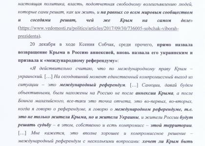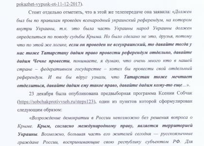 «Я думаю, что Россия ответственна за те ужасные международные отношения, которые сложились. Мы нарушили нормы международного права, согласно международному праву Крым — украинский», — сказала тогда Собчак. Однако этим «политик» не ограничилась: в других своих высказываниях и заявлениях она, по сути, призвала к соответствующему референдуму, а это уже куда серьезней.