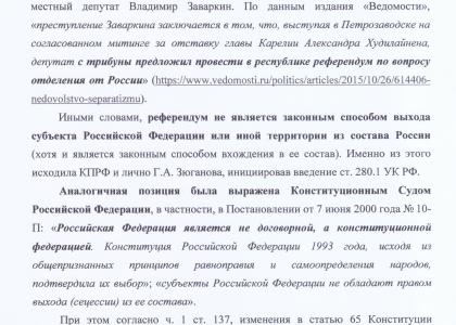 «Иными словами, референдум не является законным способом выхода субъекта Российской Федерации или иной территории из состава России (хотя и является законным способом вхождения в ее состав). Именно из этого исходила КПРФ и лично Г.А. Зюганова, инициировав введение ст. 280.1 УК РФ. Аналогичная позиция была выражена Конституционным Судом Российской Федерации, в частности, в Постановлении от 7 июня 2000 года № 10-П: «Российская Федерация является не договорной, а конституционной федерацией. Конституция Российской Федерации 1993 года, исходя из общепризнанных принципов равноправия и самоопределения народов, подтвердила их выбор»; «субъекты Российской Федерации не обладают правом выхода (сецессии) из ее состава» - указывается в документе.