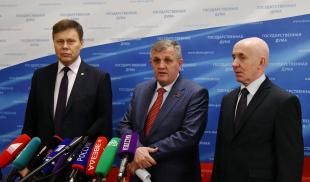 21 февраля, предваряя пленарное заседание Госдумы, перед журналистами выступили первый заместитель председателя Комитета ГД по труду, социальной политике и делам ветеранов Н.В. Коломейцев, первый заместитель председателя Комитета ГД по государственному строительству и законодательству Ю.П. Синельщиков и первый заместитель председателя Комитета ГД по экономической политике, промышленности, инновационному развитию и предпринимательству Н.В. Арефьев.