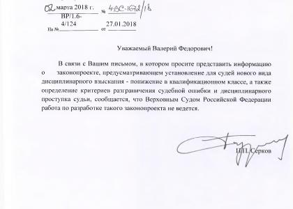 поступил ответ № 4ВС-1672/18, в котором сообщается, что Верховным судом разработка законопроекта о введении «механизма»