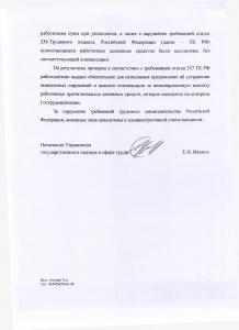 ответ № 14-1/10/ФС-225, в котором сообщается, что в ходе проверки были выявлены нарушения трудового законодательства в части несвоевременной выплаты заработной платы и