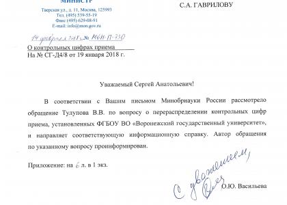 науки Российской Федерации Ольге Васильевой, попросив вернуть журфаку ВГУ