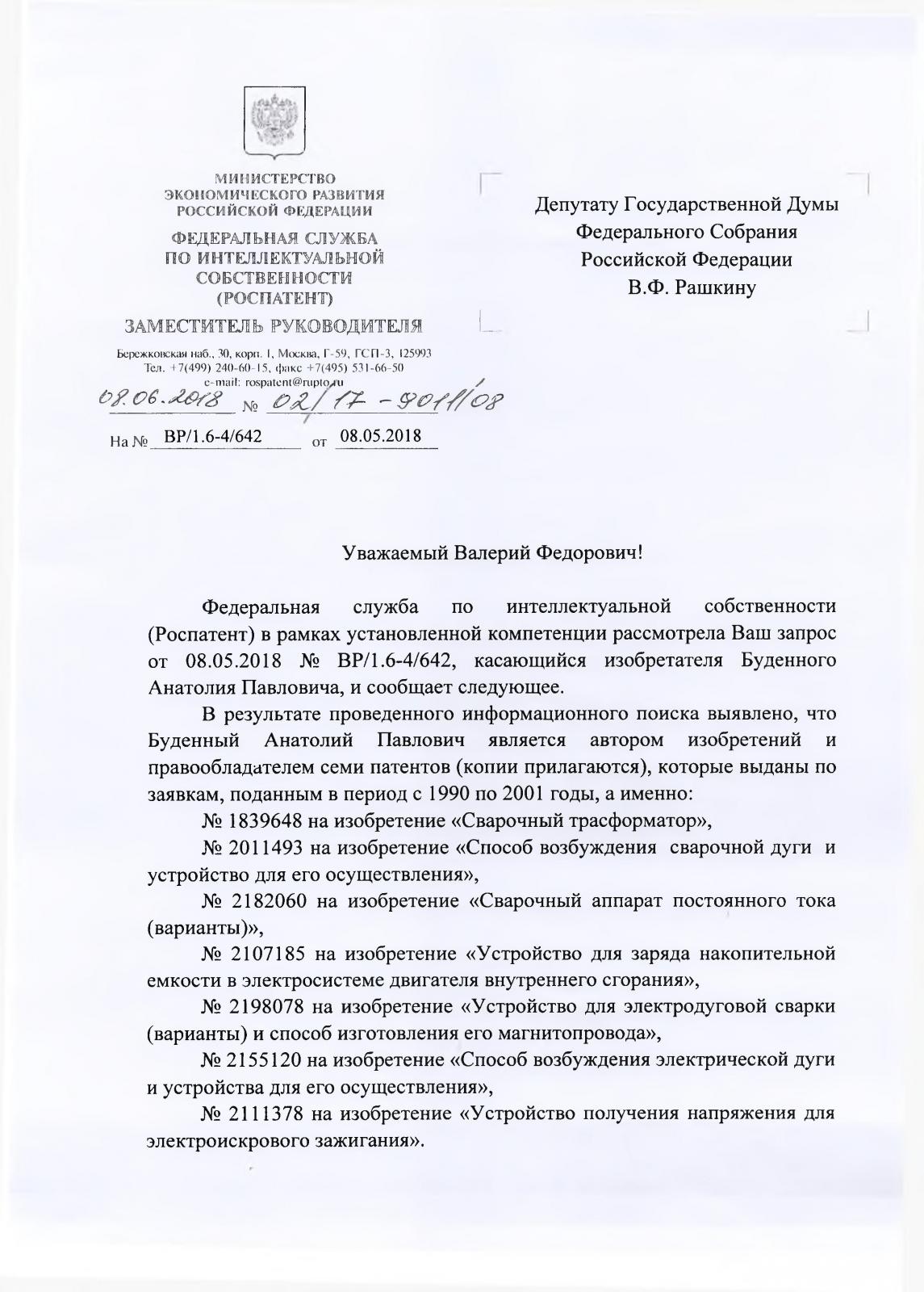 года в адрес Государственной Думы поступил ответ Роспатента №02/17-901/08, в