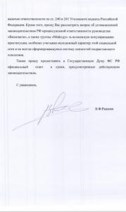 Депутат Госдумы Валерий Рашкин направил депутатский запрос на имя Генерального прокурора РФ Юрия Чайки и Председателя Следственного комитета РФ Александра Бастрыкина. В нем парламентарий попросил проверить получившую печальную известность в последнее время сеть «Вконтакте» и группу «Мейл.ру» за возможную популяризацию проституции.