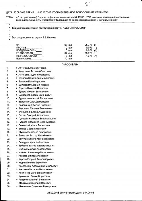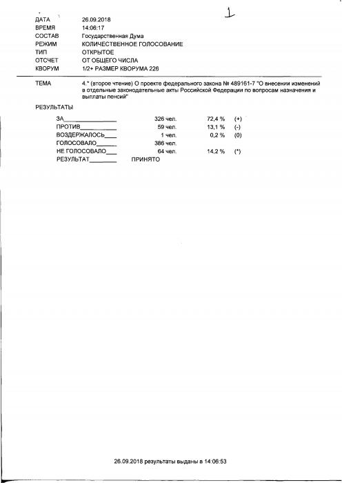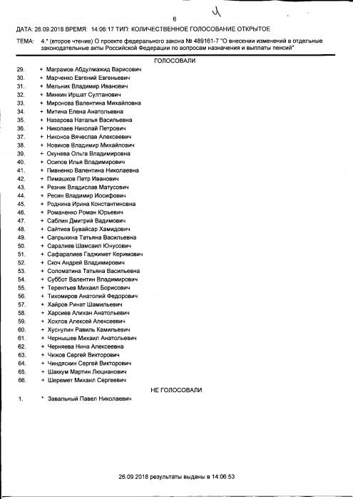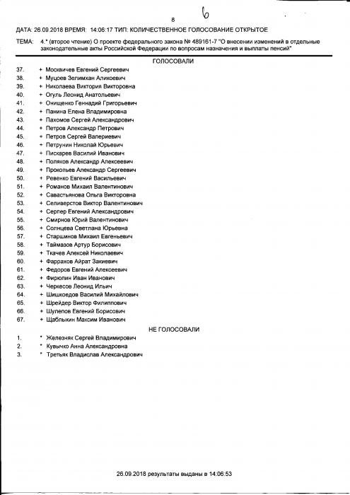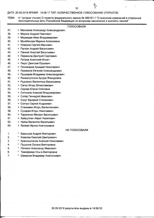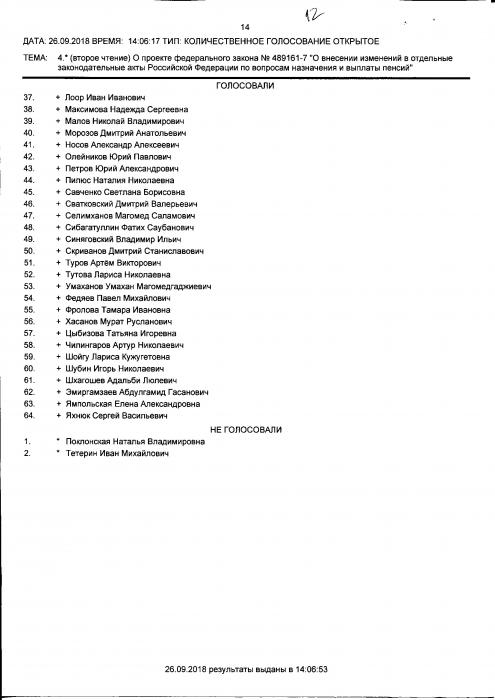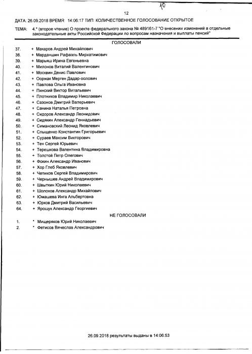 26 сентября Государственная Дума голосами «Единой России» приняла во втором чтении законопроект о повышении пенсионного возраста для женщин до 60 лет и для мужчин до 65 лет. Публикуем результаты поименного голосования.