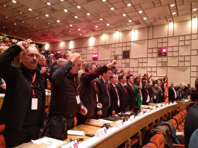 Наша сила – в нашей солидарности, товарищи. Поэтому закончить я хочу нашим великим лозунгом: «Пролетарии всех стран, соединяйтесь!».
