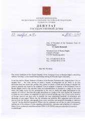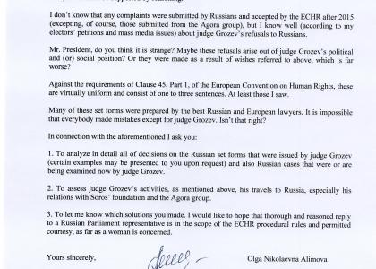Депутат Госдумы О.Н. Алимова направила письмо Президенту Европейского Суда по правам человека доктору Guido Raimondi.