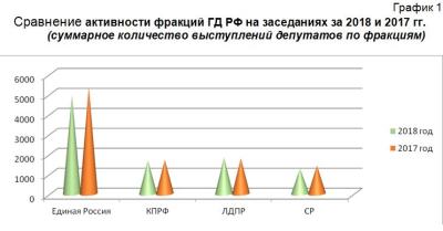 На пленарных заседаниях в течение 2018 года больше всего выступали представители правящей партии «Единая Россия», имеющая в Государственной Думе абсолютное большинство депутатских мандатов – 343 из 450. Всего за этот период в думских стенограммах зафиксированы 4942 или 51,1% их выступлений от общего числа за 2018 год. (Табл.1, гр.1).