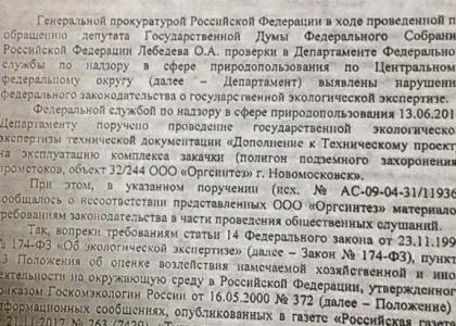 Нарушения были допущены при проведении государственной экологической экспертизы проектной документации ООО «Оргсинтез» в г. Новомосковске.