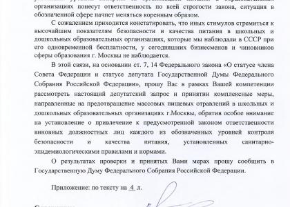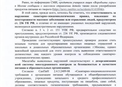 «Масштабы выявленных нарушений свидетельствуют о дезорганизации всей системы многоуровневого контроля за безопасностью и качеством питания в образовательных организациях, — посетовал парламентарий. —С сожалением приходится констатировать, что иных [кроме принудительных] стимулов стремиться к высочайшим показателям безопасности и качества питания в школьных и дошкольных образовательных организациях, которые мы наблюдали в СССР при его одновременной бесплатности, у сегодняшних бизнесменов и чиновников сферы образования Москвы не наблюдается».