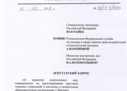 Депутат Госдумы от фракции КПРФ Валерий Рашкин направил запрос в Генпрокуратуру, МВД и Роспотребнадзор с призывом «принять комплексные меры» для предотвращения отравлений детей в школах и детских садах. Парламентарий считает, что правоохранители должны найти виновных в массовом отравлении несовершеннолетних в Москве в конце 2018 года и привлечь ответственных за правонарушения к уголовной ответственности. Рашкин также указал на безобразную, по его мнению, организацию контроля за качеством продуктов в образовательных учреждениях, которую необходимо привести в порядок.