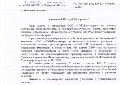 05.04.2019 года в адрес Государственной Думы поступил ответ №3/196101163314 из ГУ МВД России по Краснодарскому краю, в котором сообщалось, что при рассмотрении обращения жителей правоохранительные органы установили признаки уголовно-наказуемого деяния, предусмотренного статьей 159 УК РФ, в связи с чем результаты проверки были зарегистрированы в книге учёта заявлений и сообщений о преступлениях, а материал направлен для дальнейшей проверки в УМВД России по городу Краснодару.