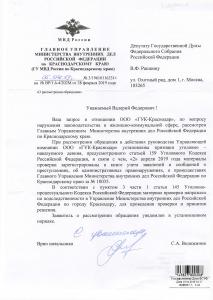 05.04.2019 года в адрес Государственной Думы поступил ответ №3/196101163314 из ГУ МВД России по Краснодарскому краю, в котором сообщалось, что при рассмотрении обращения жителей правоохранительные органы установили признаки уголовно-наказуемого деяния, предусмотренного статьей 159 УК РФ, в связи с чем результаты проверки были зарегистрированы в книге учёта заявлений и сообщений о преступлениях, а материал направлен для дальнейшей проверки в УМВД России по городу Краснодару.