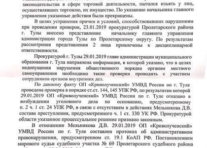 Но будем объективны: буквально через день после январских погромов - 23.01.2019 – прокуратурой Пролетарского района г. Тулы было внесено представление начальнику главного управления администрации города Тулы по Пролетарскому округу г-ну Шестакову. По результатам рассмотрения представления 2 лица привлечены к дисциплинарной ответственности. Правда, не уточняется, в чём именно заключалась эта ответственность. Их уволили? Вряд ли. Лишили премии? Верится с трудом? Погрозили пальчиком? А вот это – скорее всего.