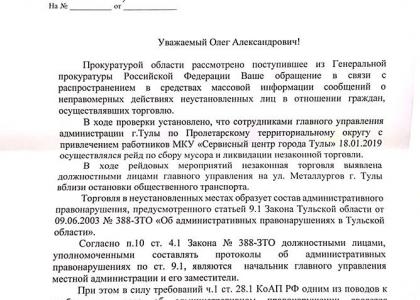 В конце января мною было направлено обращение Генеральному прокурору РФ с требованием разобраться и привлечь к ответственности чиновников, которые устроили погром на микрорынках Пролетарского района Тулы, разгоняя бабушек за «несанкционированную торговлю».