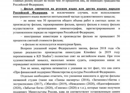 Также он добавил, что в законе говорится о необходимости преимущественно использовать русский язык при съемках, а также о невозможности иностранных инвесторов вкладывать в создание фильма более 50% от сметной стоимости картины. В запросе Рашкин указал, что вопреки указанным нормам фильм «За гранью реальности», произведенный Kinodanz и вышедший в 2018 году, полностью снят на английском языке. «При этом художественный замысел, насколько можно судить, совершенно никак не оправдывает использование иностранного языка», — отмечается в документе.
