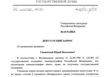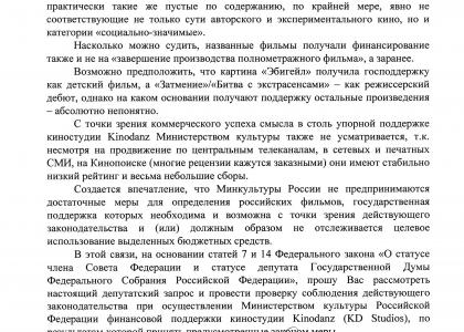 Депутат Государственной думы от фракции КПРФ Валерий Рашкинотправил депутатский запрос генеральному прокурору Юрию Чайке с целью проверить соблюдения законодательства при выделении Минкультуры средств киностудии KD Studios (до 2019 года называлась Kinodanz).
