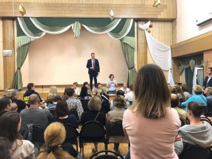 На встречу прибыл депутат Государственной Думы фракции КПРФ Парфенов Денис Андреевич. Всего собралось около 100 родителей, которые не поместились в кабинете №105 школьного музея. Встреча была перенесена в актовый зал.