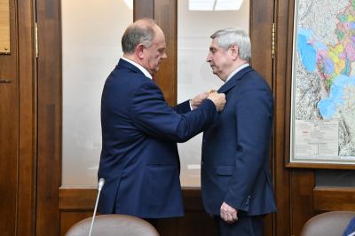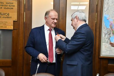 В свою очередь, И.И. Мельников вручил памятную награду Председателю ЦК КПРФ, Руководителю фракции КПРФ в Госдуме Г.А. Зюганову.