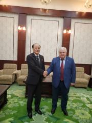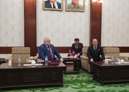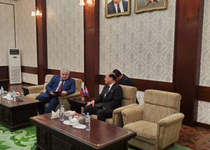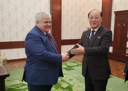 В понедельник, 13 апреля, в посольстве КНДР в России состоялась встреча посла КНДР Син Хон Чхоля и секретаря ЦК КПРФ, заместителя Председателя Комитета ГД по делам СНГ, евразийской интеграции и связям с соотечественниками, руководителя депутатской группы дружбы с Парламентом КНДР Казбека Куцуковича Тайсаева.