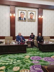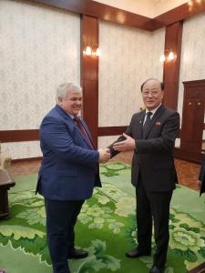 В понедельник, 13 апреля, в посольстве КНДР в России состоялась встреча посла КНДР Син Хон Чхоля и секретаря ЦК КПРФ, заместителя Председателя Комитета ГД по делам СНГ, евразийской интеграции и связям с соотечественниками, руководителя депутатской группы дружбы с Парламентом КНДР Казбека Куцуковича Тайсаева.