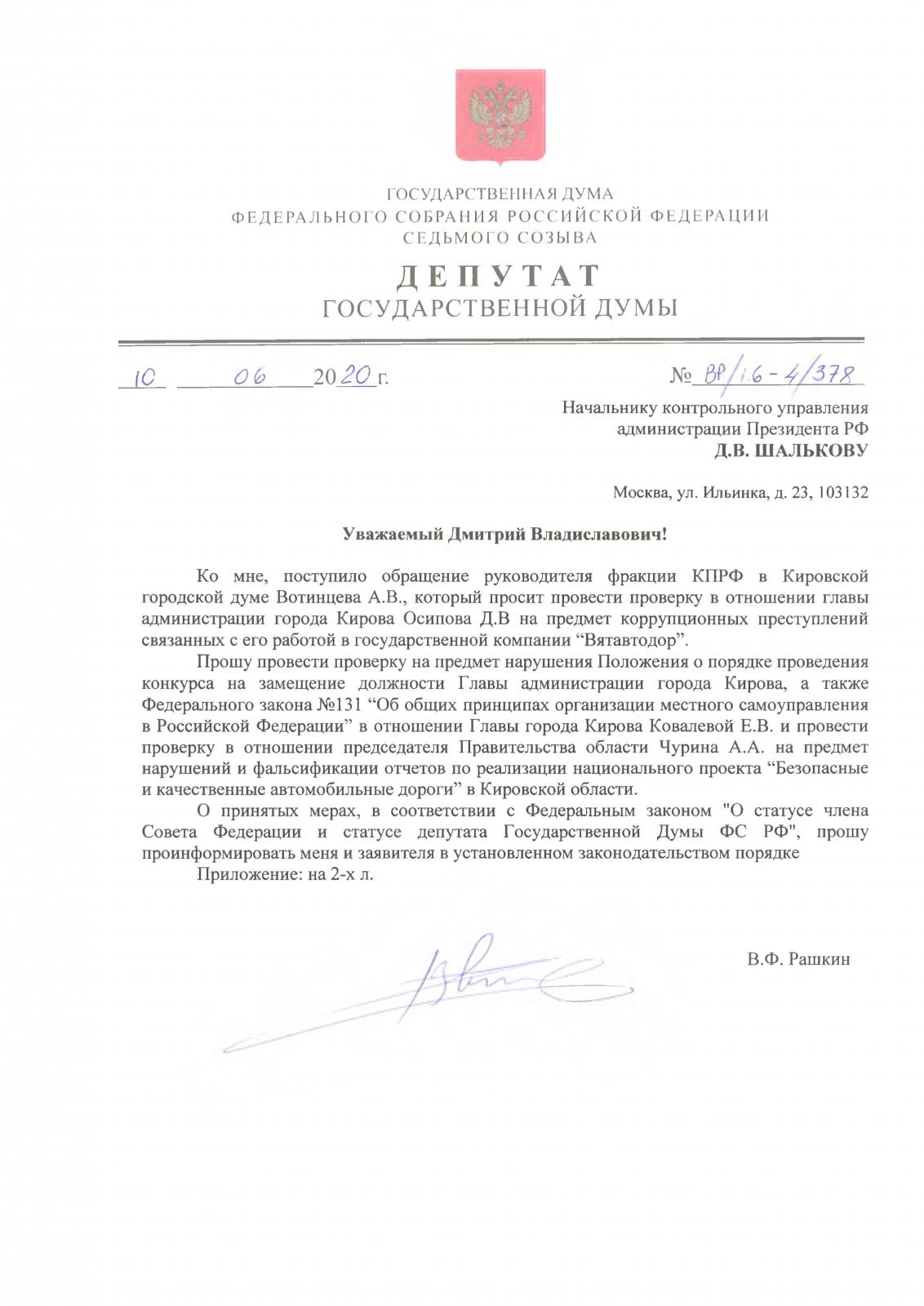 Депутат Госдумы Валерий Рашкин направил запросы в Генпрокуратуру и администрацию Президента с требованием провести проверку на предмет коррупционных преступлений в отношении кировских вип-чиновников Чурина, Ковалевой и Осипова