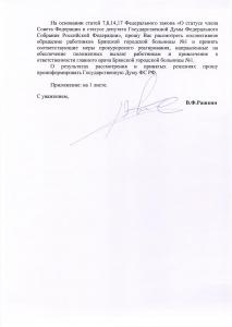 Рассмотрев данное обращение, депутат Государственной Думы VI созыва С.П. Обухов и депутат Государственной Думы VII созыва В.Ф. Рашкин направили депутатский запрос в прокуратуру Брянской области, указав на незаконное самоуправство главного врача и незаконность его действий, выразившихся в лишении стимулирующих выплат на основании личных мотивов.