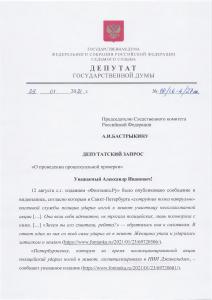 Депутат Госдумы от КПРФ Валерий Рашкин направил депутатский запрос в адрес главы Следственного комитета РФ Александра Бастрыкина — он призвал организовать и взять на контроль процессуальную проверку в отношении полицейского, который в ходе протестов 23 января в Санкт-Петербурге пнул в живот 54-летнюю женщину.
