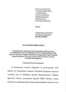 Фракция КПРФ в Государственной Думе подготовила парламентский запрос генеральному прокурору Российской Федерации Игорю Краснову. Запрос касается руководителя фракции КПРФ в Законодательном собрании Иркутской области Андрея Левченко. В сентябре прошлого года Левченко задержали и завели на него уголовное дело по обвинению в мошенничестве.