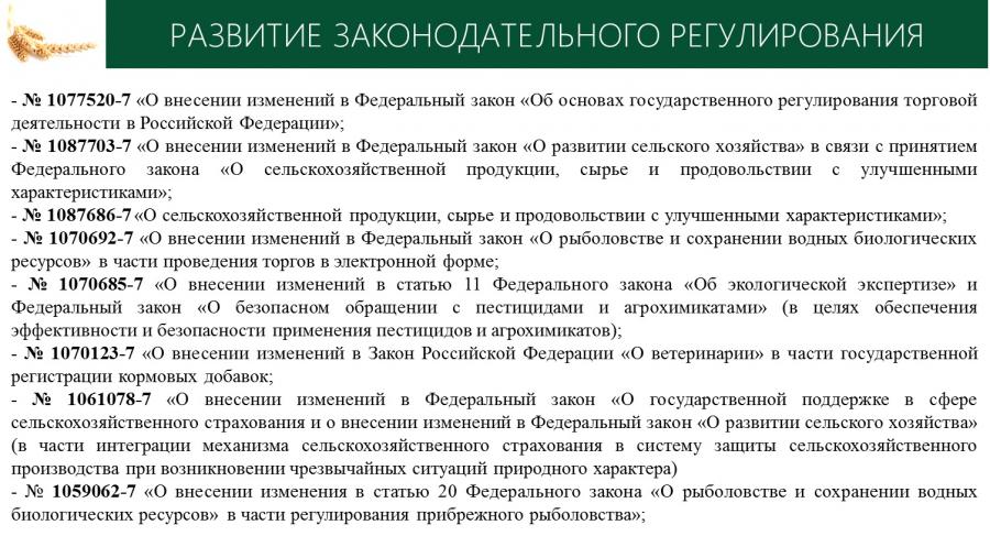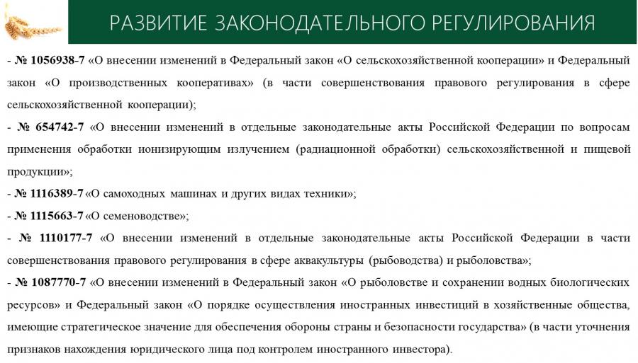 При этом сейчас ведется активная работа над такими инициативами, как закон «О семеноводстве», «О племенном животноводстве», всем, что связано с зеленым брендом, и т.д., включая вопросы добычи водно-биологических ресурсов.