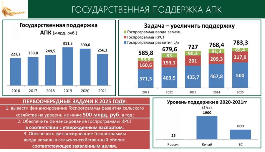 Господдержка АПК должна быть восстановлена, а с учетом инфляции и вовсе на главные программы увеличена. В первую очередь – это госпрограмма развития сельского хозяйства. Госпрограмма комплексного развития сельских территорий должна быть полностью восстановлена в финансировании. Должна быть незамедлительно утверждена программа "второй целины"!