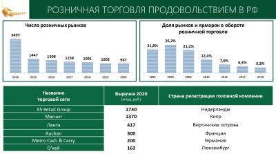 В крупнейших продовольственных торговых сетях уже сложился оборот больше 4 трлн. рублей. А ведь все они зарегистрированы в офшорах. И это должно обязательно приниматься во внимание при подготовке решений по регулированию цен, ведь в этом контексте становятся более явными истинные причины роста цен и сложившейся в России системы ценообразования на продовольствие.