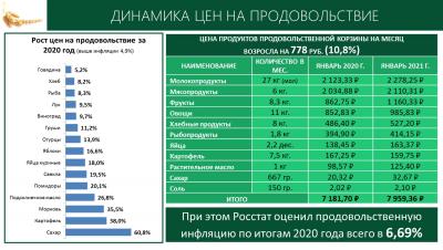 Продовольственная корзина подорожала почти на 800 рублей! А это более 10%, при том, что официальная продовольственная инфляций по итогам 2020 года составила 6,7%, а общая инфляция – 4,9%.