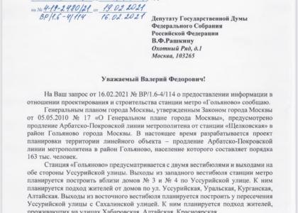 Итак, вице-мэр столицы по вопросам градостроительной политики и строительства А.Ю.Бочкарев сообщил «Народной приемной»: «Станция «Гольяново» предусматривается с двумя вестибюлями и выходами на обе стороны Уссурийской улицы.Выходы из западного вестибюля станции метро планируется построить вблизи домов № 3 и № 4 по Уссурийской улице. К ним планируется подход жителей от домов по ул. Уссурийская, Уральская, Курганская, Алтайская. Выходы из восточного вестибюля планируется построить у пересечения Уссурийской улицы с Сахалинской улицей. К ним планируется подход жителей, проживающих на улицах Хабаровская, Алтайская, Красноярская… Материалы по результатам общественного обсуждения по проекту планировки территории линейного объекта — продление Арбатско-Покровской линии Московского метрополитена от станции «Щелковская» до станции «Гольяново» (далее — ППТ) опубликованы 02.09.2020 на портале «Активный гражданин». Утверждение ППТ по данному объекту планируется во 2 кв. 2021 г.».