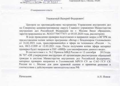 «В ходе проверки подготовлен и направлен запрос в ВГТРК на предоставление копии записи программы «Вечер с Владимиром Соловьевым» от 16.02.2021 года, транслировавшейся в эфире на телеканале «Россия 1», — сказано в ответе ГУ МВД России по г. Москве.